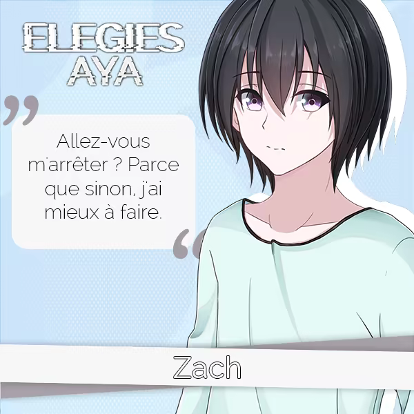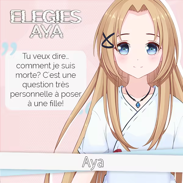ELEGIES: Aya est un roman visuel à suspense moderne. La maison de Zach est en train de brûler. Même s’il parvient à s'échapper des flammes, ses parents sont moins chanceux. Après avoir perdu connaissance, il se réveille à l’hôpital, où il rencontre une fille énergique et amicale du nom d’Aya. Mais Aya est bien plus que ce que l'on croit, car il s'avère qu'elle est... un fantôme ! Quel est le problème avec Aya, et pourquoi Zach est le seul à la voir ?