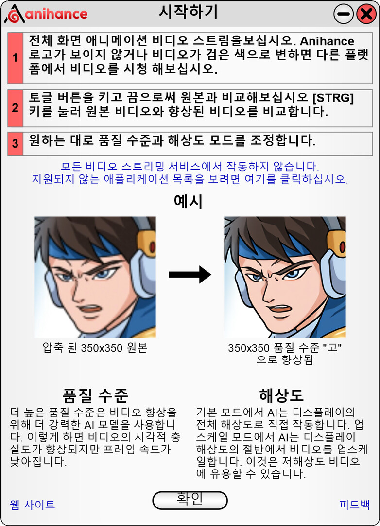 Anihance 소프트웨어는 웹 브라우저 또는 비디오 플레이어에서 비디오를 보는 동안 실시간으로 애니메이션의 비디오 품질을 향상시킵니다.