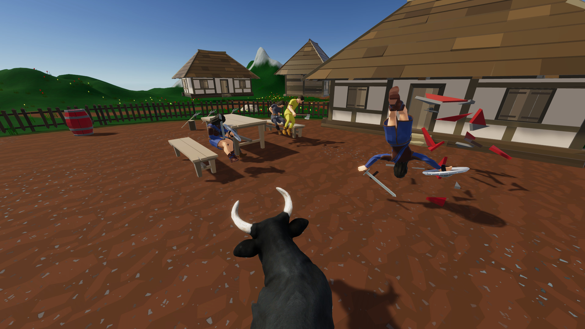 Have you ever wondered what it's like to be a four-legged pile of muscles with two sharp horns? Now you have a chance to run around and destroy anything that stands on your way. With the mouse, you have a full control over the bull's head movement. The game uses advanced active ragdoll physics - enemies are not just puppets, the animation only drives the physics engine, so you can interact with their movement.
