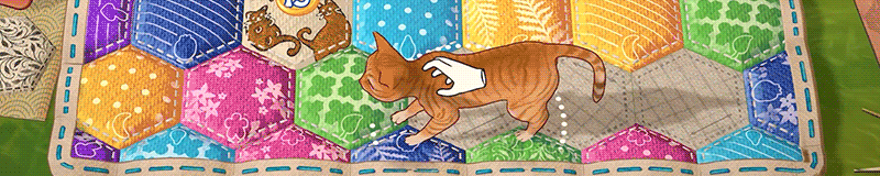 In Quilts & Cats of Calico, cats are active during your games. Sometimes minding their own business, and other times coming to you and your quilt. They will lazily observe the board, romp and run around, and sometimes fall into a blissful nap. They are cats, you never know. You can interact with them during the game, pet them, and shoo them away when they get in the way.