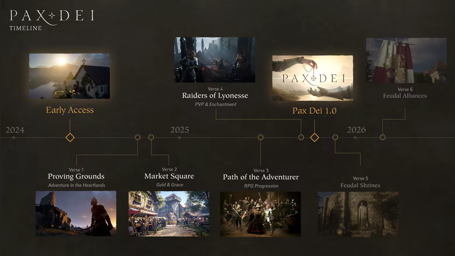 Begin your adventure into the world of Pax Dei. Use the public crafting stations to build your first tools and gear. Explore the wilds, battle enemies for Gold and loot, and trade, or fight, with other players. Accumulate Grace to perform Miracles and claim your own Plot of land inside the game. Welcome to our world.
