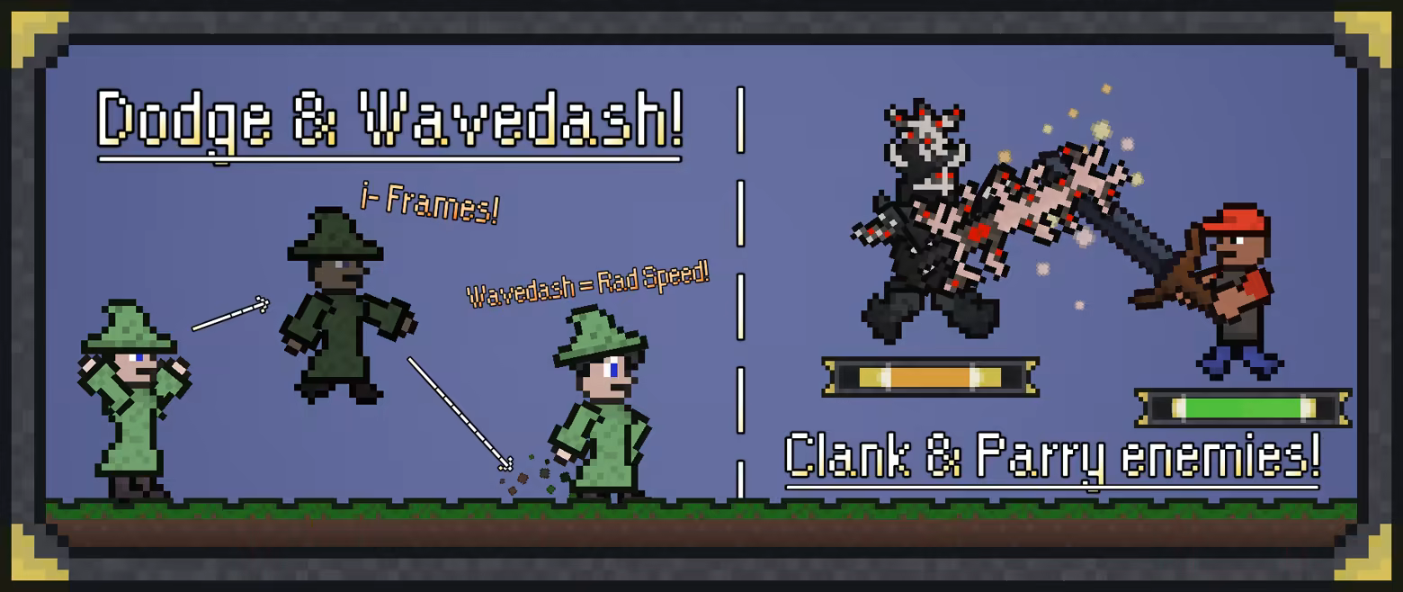 Dodge to move and gain invulnerability frames! Hit enemy attacks with your own to deflect & clank with theirs! Break down enemy poise to stagger them and go in for the kill! Every weapon has both a regular attack and a special attack, allowing for a wide variety of skill expression! Even dodge into the ground to wavedash and gain massive speed - we have it all!