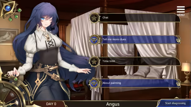 Enter the dream world during the nighttime, and interact with Angus by chatting with and diagnosing her.
