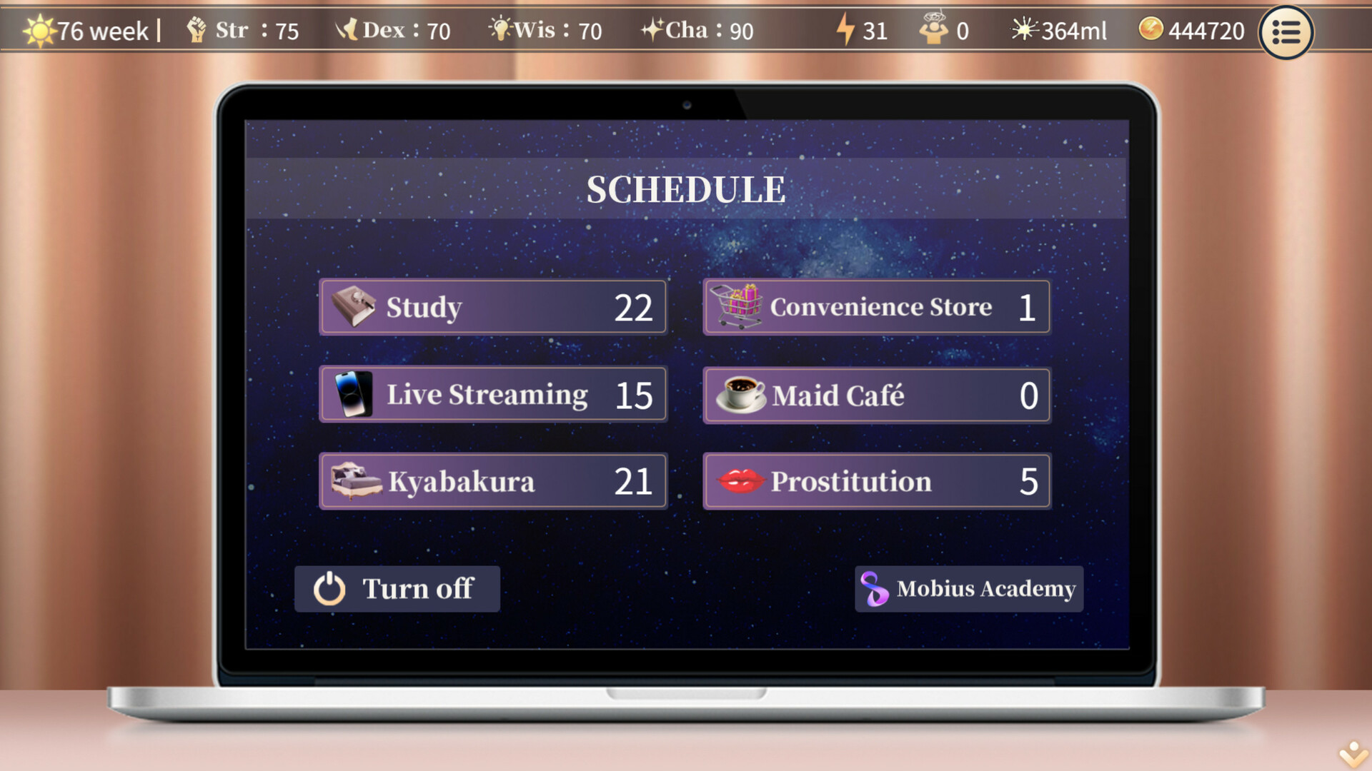The game lasts two years and offers six different itineraries to explore: Research, Convenience Store, Live Streaming, Maid Cafe, Hotel, and Selling Sex. Unlike a traditional simulation game, each of the six itineraries has its own plot and H-events, and the order of execution and decision-making can have multiple effects on the outcome.