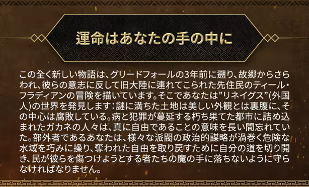 “本日早期アクセスをプレイすることで、ゲームの最初の部分を発見できます。ティール・フラディ島での冒険の始まりから、星の街オリマまでです。あなたは自分のキャラクターを作成し、さまざまなスキルセットから選択する必要があります。数多くのクエストやダンジョンがある多様な地域や豊かな環境を探索し、自分の運命を自由に切り開くことができます。また、あなたのチームに加わり、旅を共にする最初の仲間たちと出会います。そこでは、あなたの選択と決断が重要となり、冒険に影響を与えます。最後に、ダイナミックなアクションと戦術的な選択を組み合わせた新しい戦闘システムを、アクティブポーズを介して体験できます。これにより、グループ全体を制御し、より細かく戦略を準備できます。このシステムは、GreedFall 2: The Dying Worldの最終リリースまで、プレイヤーのフィードバックのおかげで改善され続けます。”