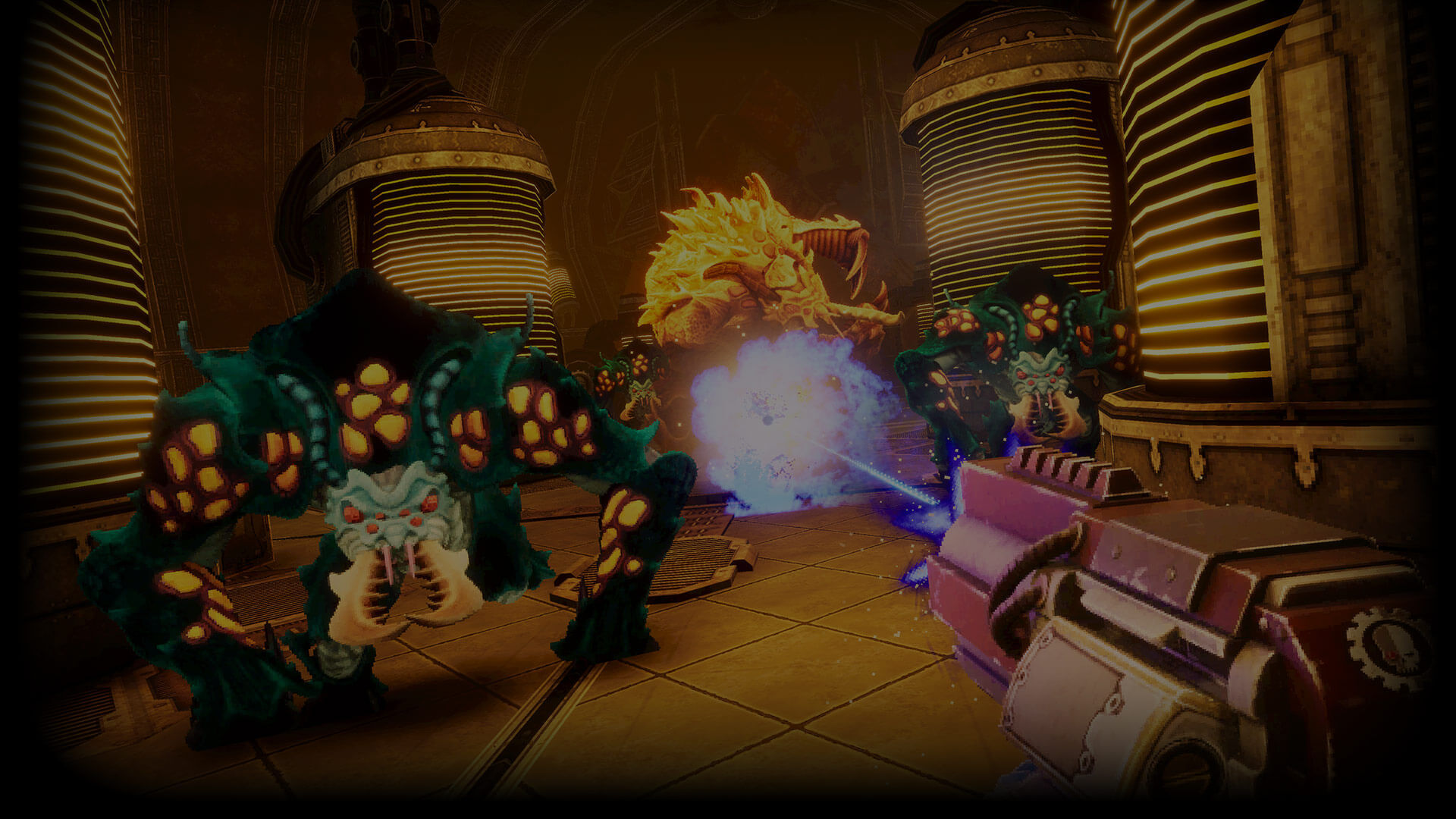 Experience a perfect blend of Warhammer 40,000, classic, frenetic FPS gameplay and the stylish visuals of your favourite 90’s titles. In glorious boomer shooter style, unleash your devastating weapons as you blast through an explosion of sprites, pixels and blood. Discover an exceptional aesthetic, with retro cutscenes and pixel art backdrops, paying tribute to a historic era in video games.