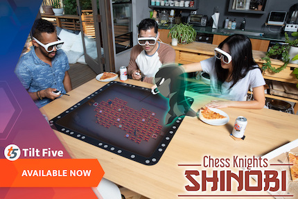 Level up your game night with tabletop holograms! The Tilt Five™ holographic gaming system transforms tabletop and video games into 3D vibrant holographic environments. Using the Tilt Five™ augmented reality (AR) glasses, Gameboard, and Wand controller, you can immerse yourself--and friends--in experiences like never before. Visit Tilt Five's website to find out how to bring Chess Knights: Shinobi alive on your tabletop!