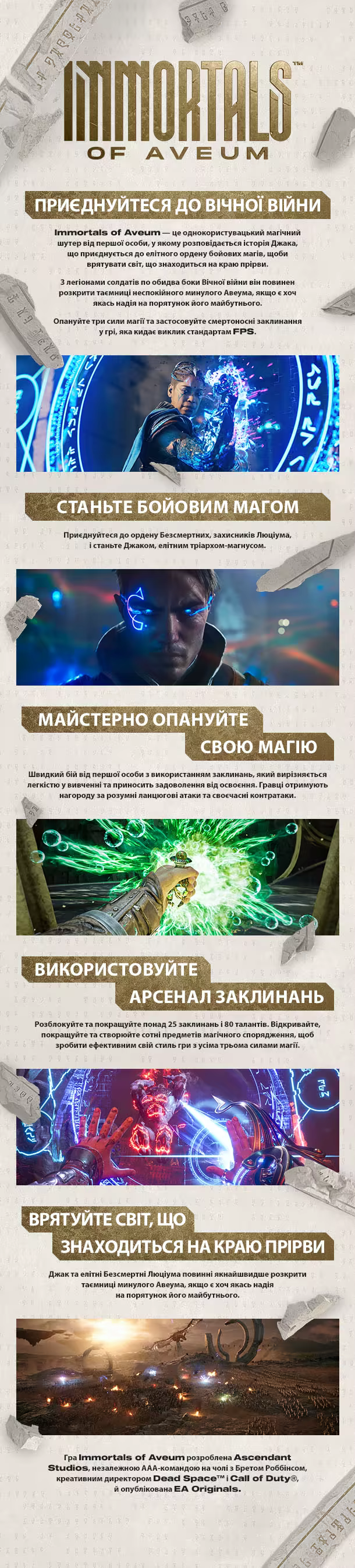 Immortals of Aveum — це однокористувацький магічний шутер від першої особи, у якому розповідається історія Джака, що приєднується до елітного ордену бойових магів, щоби врятувати світ, що знаходиться на краю прірви.