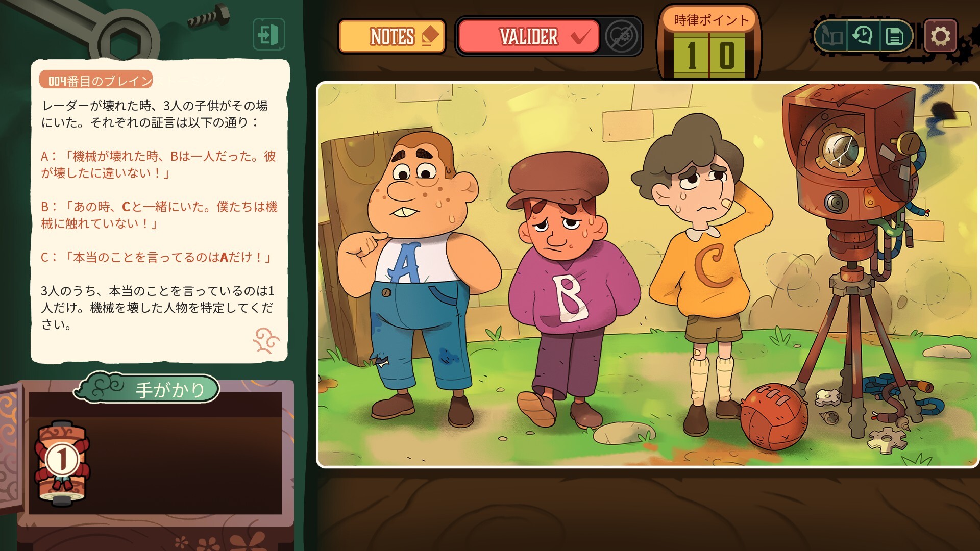 本作には多彩で豊富な謎が用意されており、どれも観察力、推理力、論理的思考力を存分に試す楽しさにあふれている。行き詰まったときは、左下のヒントをいつでも確認できるので、詰まって先へ進めなくなる心配はない。