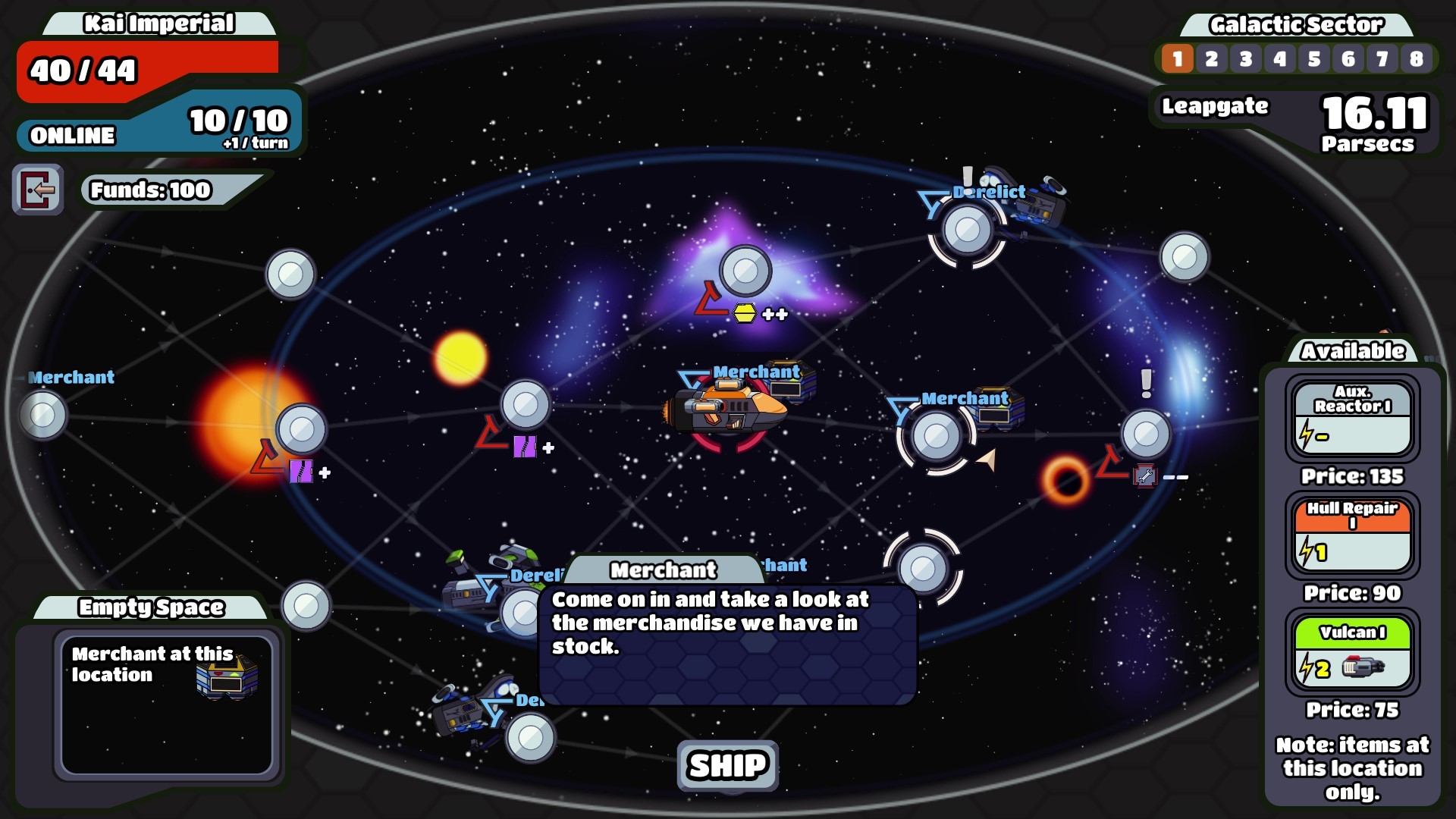 Each new game is a trip into the unknown, with galactic sector maps, events and opponents generated afresh each time. Pay attention to info available on the surrounding area, and choose your routes wisely.
