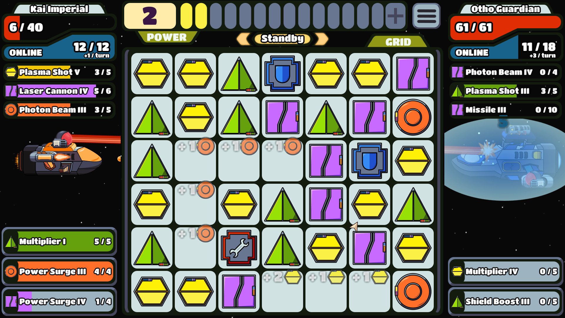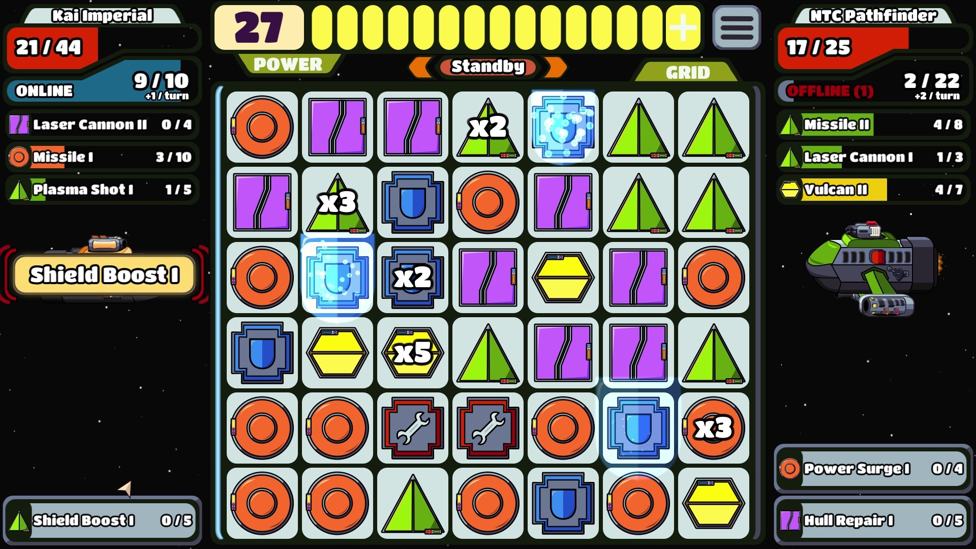 A variety of ships to choose from and unlock, with different strengths and weaknesses to handle and work around. Your active systems need power, but too much of a drain and your ability to match on the battle grid may be hampered.