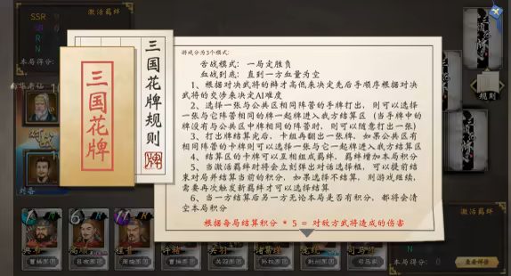 According to the card got from neutral zone, settled combination can be formed, and each of combination has their own points. Activating the combination will lead to settle point and end the game; or yield the settlement to obtain more combinations; however, the next settlement needs a new combination activaction, after giving up. A draw occurs when both sides have not settled their hands.