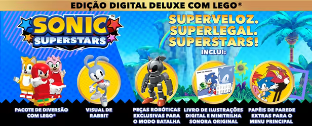 SONIC SUPERSTARS Edição Digital Deluxe com LEGO® contém SONIC SUPERSTARS e a Atualização Deluxe Digital com LEGO®, que inclui: