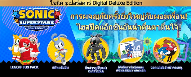 ""โซนิค ซูเปอร์สตาร์ Digital Deluxe"" นั้นเป็นแพ็กรวมตัวเกม ""โซนิค ซูเปอร์สตาร์"" และ DLC ""Digital Deluxe Upgrade"" รวมอยู่ด้วย! พร้อมด้วย DLC และไอเทมพิเศษจากความร่วมมือกับ LEGO® อีกมากมาย!