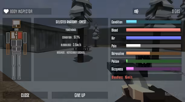 The game contains realistic blood pooling and dismemberment along with semi realistic active ragdolls which react to wounds and scenarios.