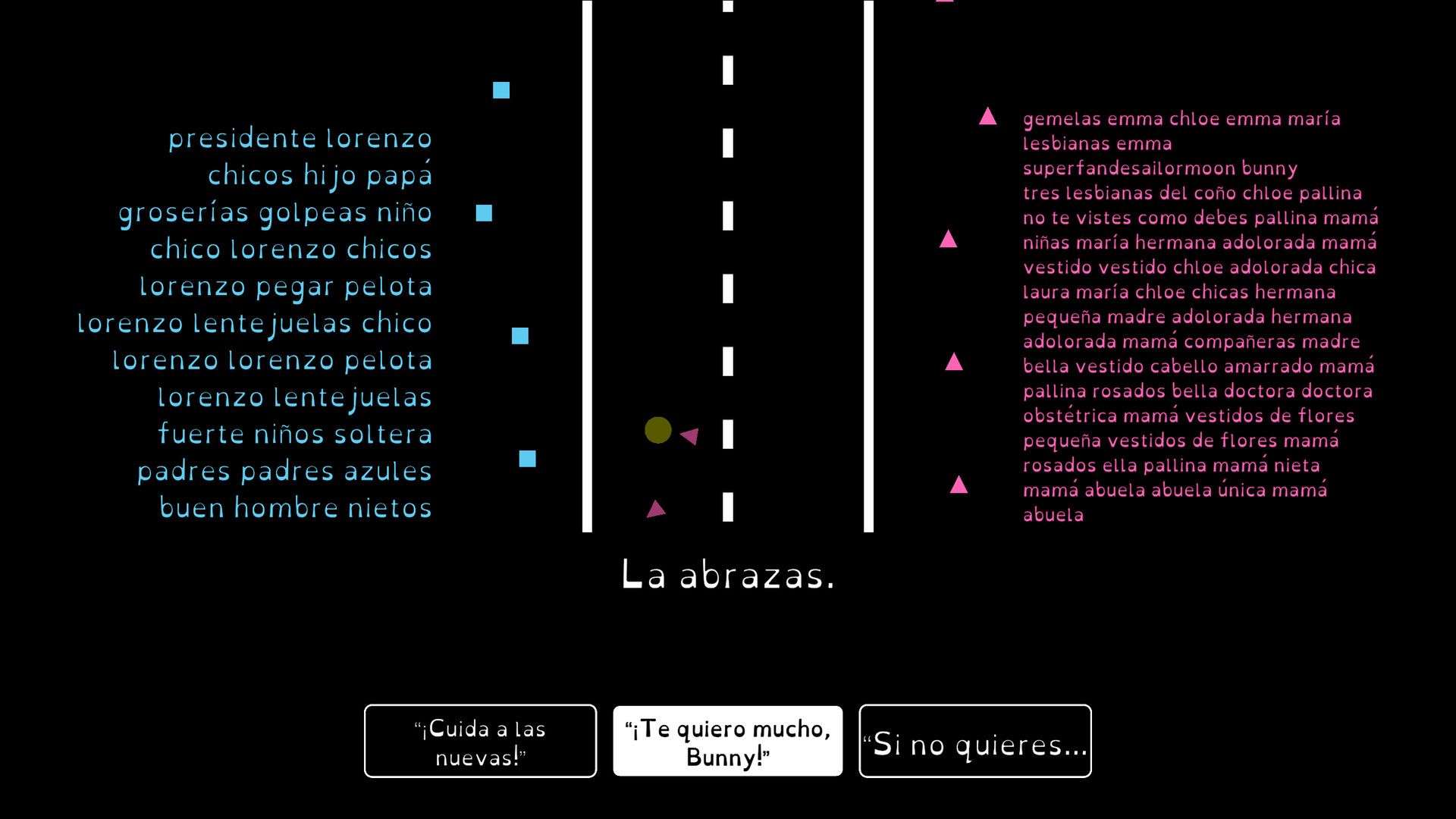 "non-binary" es un videojuego que mezcla opciones de texto y bullet hell para contar la historia del viaje de autodescubrimiento de dos personas no binarias. Toma tus decisiones. Esquiva las palabras. Atraviesa las cosas que te duelen sin derrumbarte. Si puedes.