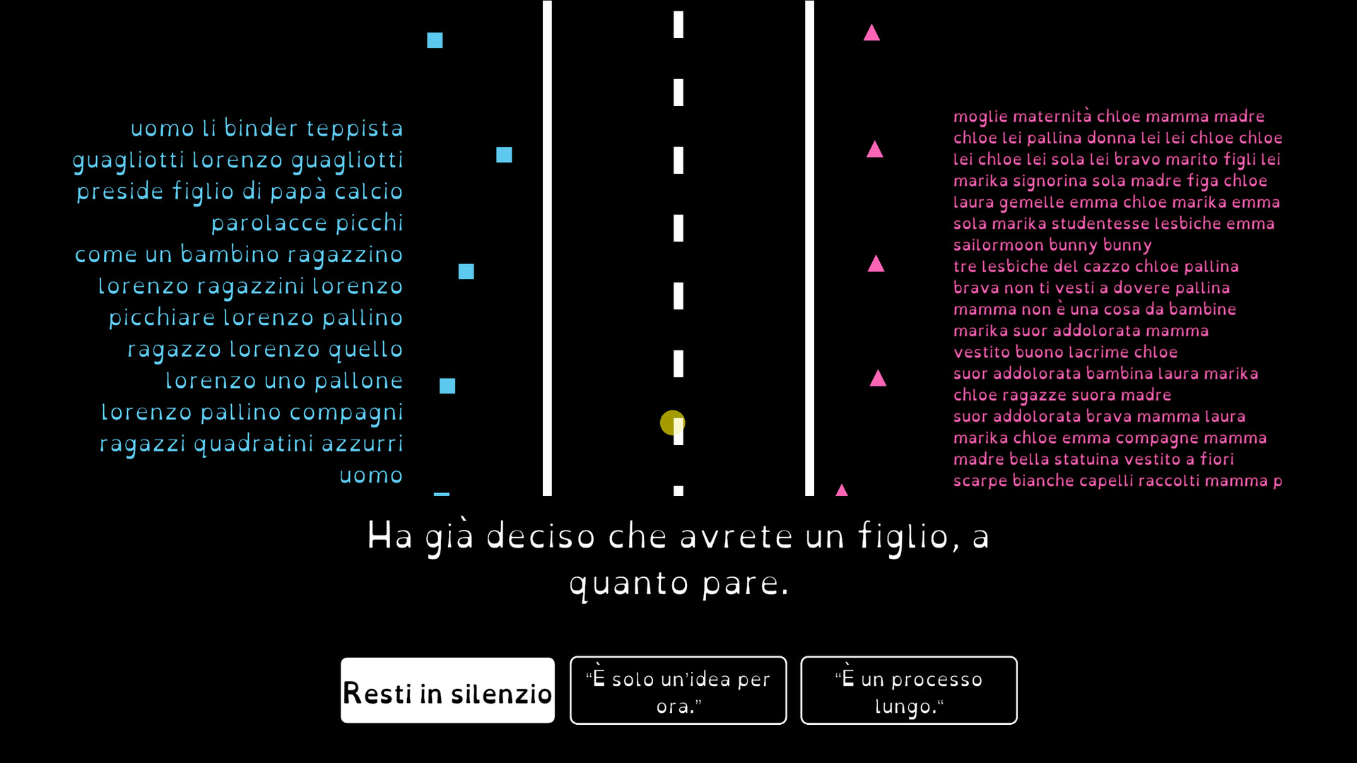 ti consigliamo di seguire tutte e due le storie: unendo esperienze personali e le testimonianze di chi ci ha supportatɜ, abbiamo creato due percorsi molto diversi. le vite delle persone non binarie sono tanto varie e complesse quante quelle di chiunque altro. per questo il gioco non si propone di raccontare la storia di tuttɜ, ma solo un piccolo scorcio su un mondo complesso.