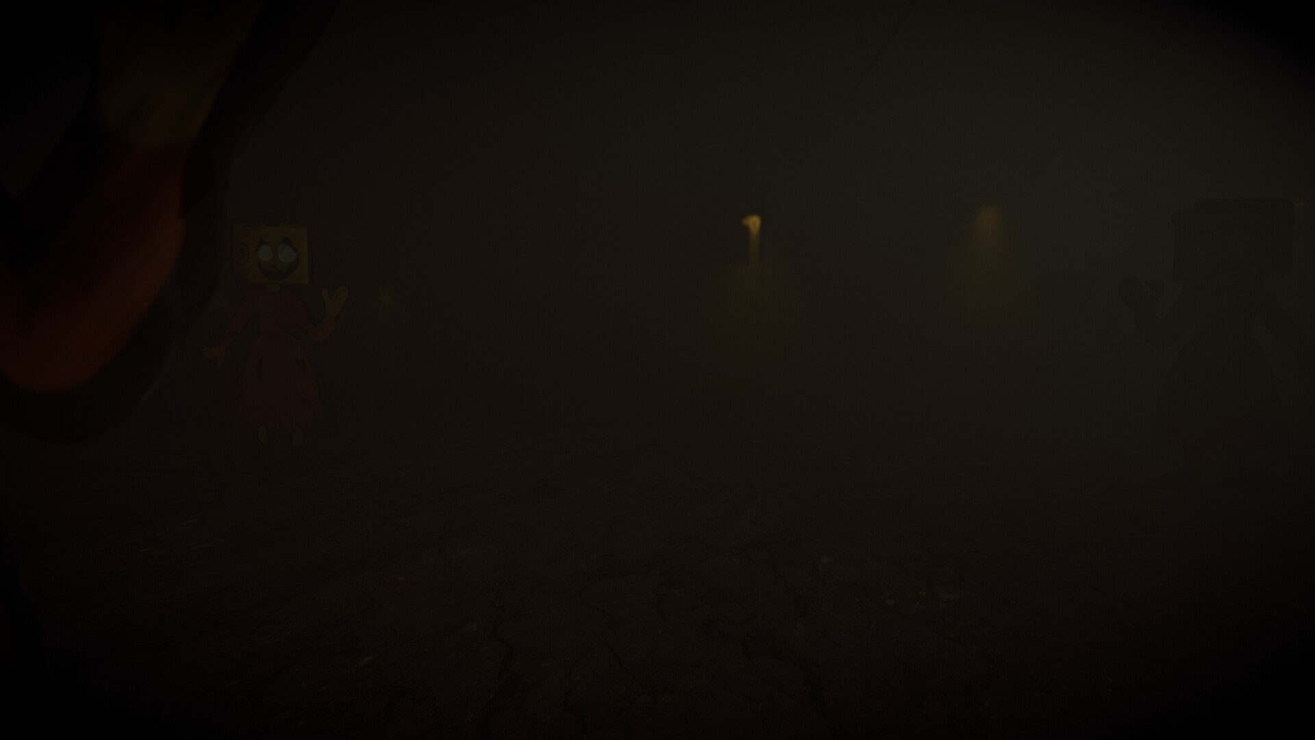 Hide inside scarecrow cutouts to avoid Lanky’s gaze. Early rounds feel safe, but cutouts decay — splintered, tilted, and unsafe — testing timing and observation.