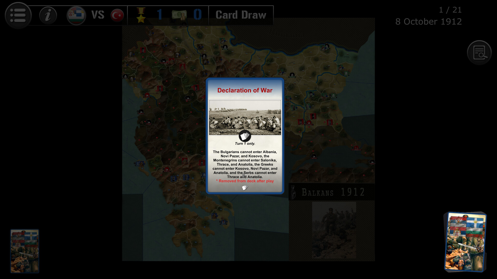 Balkans 1912 retraces the first Balkan War, which pitted the new Balkan states (Bulgaria, Serbia, Greece and Montenegro) allied together in a Coalition and eager to expand their territories at the expense of the declining Ottoman Empire. The Coalition player must quickly seize the entire Balkans. The Ottoman (Turkish) player must try to repel the multiple assaults and, above all, hold on to Istanbul.