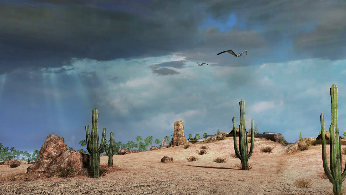 The Giganotosaurus (“giant southern lizard”) was one of the largest carnivorous dinosaurs to ever exist on Earth. With a keen sense of smell, Giganotosaurus (a therapod dinosaur) is faster than an adult Tyrannosaurus Rex, but its brain is just half the size of its famous relative. The Giganotosaurus tends to prowl in circular patterns near lakes, but it can certainly (and occasionally will!) roam the entire island, so remain alert at all times! When this monster isn’t snacking on unlucky human hunters, its usual diet consists of juvenile sauropod dinosaurs.