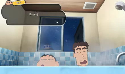 실컷 논 다음의 즐거움은 역시나 아빠와 함께 하는 목욕. 타일로 된 그리운 욕조에서는 별이 가득한 하늘을 볼 수 있습니다. 피로를 씻어 내고 내일도 힘차게 놀아 봅시다!