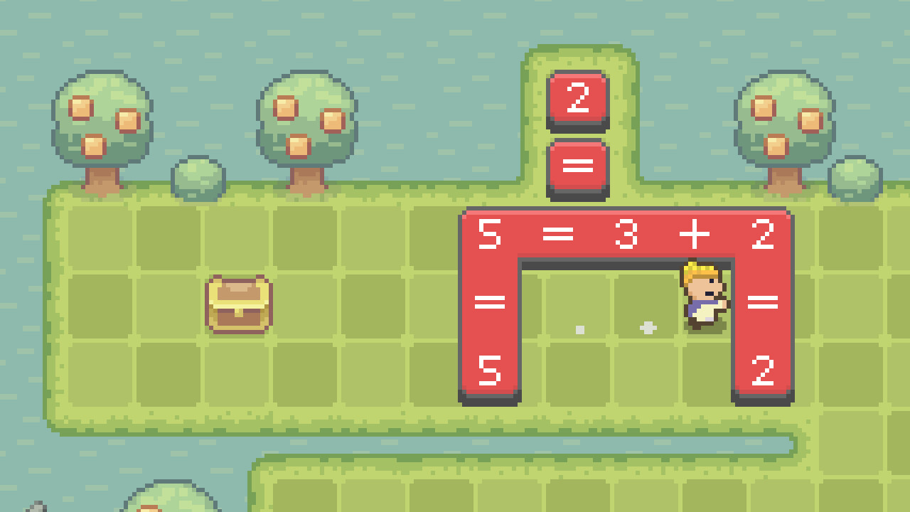 Block Buster Billy is a puzzle game where you move blocks with digits and basic math operations to form numbers and equations. When you complete an equation, it turns into a big block you can move out of the way to open the treasure chest.