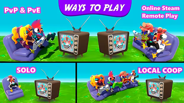 Try all available PvP and PvE modes. Play a classic "Free For All" with four friends or with bots. Check out 2vs2 and 3vs1. Or go fight off some mechanical chickens in PvE.