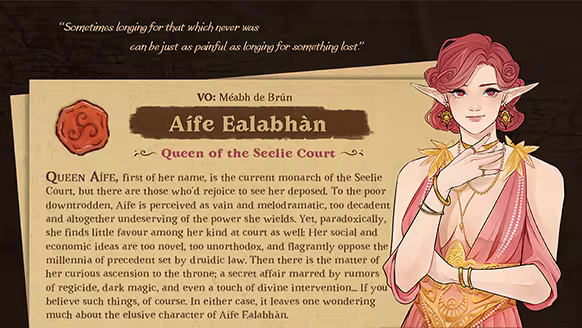 AÍFE EALABHÀN: Queen of the Seelie, a rumoured usurper falsely ordained by the gods. Voiced by Méabh de Brún.