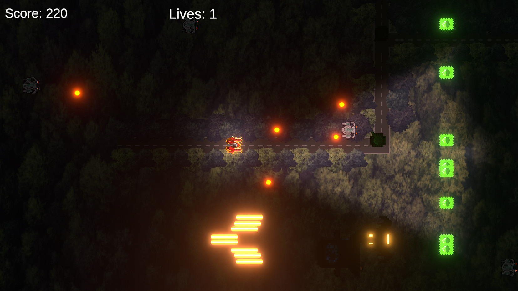 Fast paced shoot em up played across 12 levels. Point your ship in any direction, deciding constantly between extra firepower (firing in any 2 directions) and movement. Or deploy the directional shield to block bullets from a single direction, point your ship and dodge simultaneously.