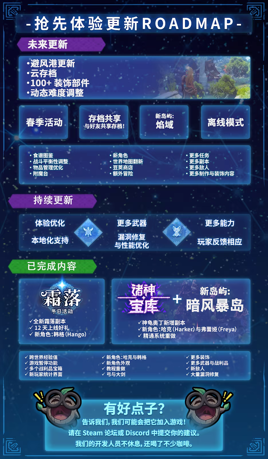 “我们目前还没有确定完整版发售的具体日期,但有一点可以肯定——我们会在抢先体验期间持续进行内容更新。此外,我们还会随时关注游戏的具体状态,并以公告和计划书等方式与玩家社群分享未来的开发计划。”