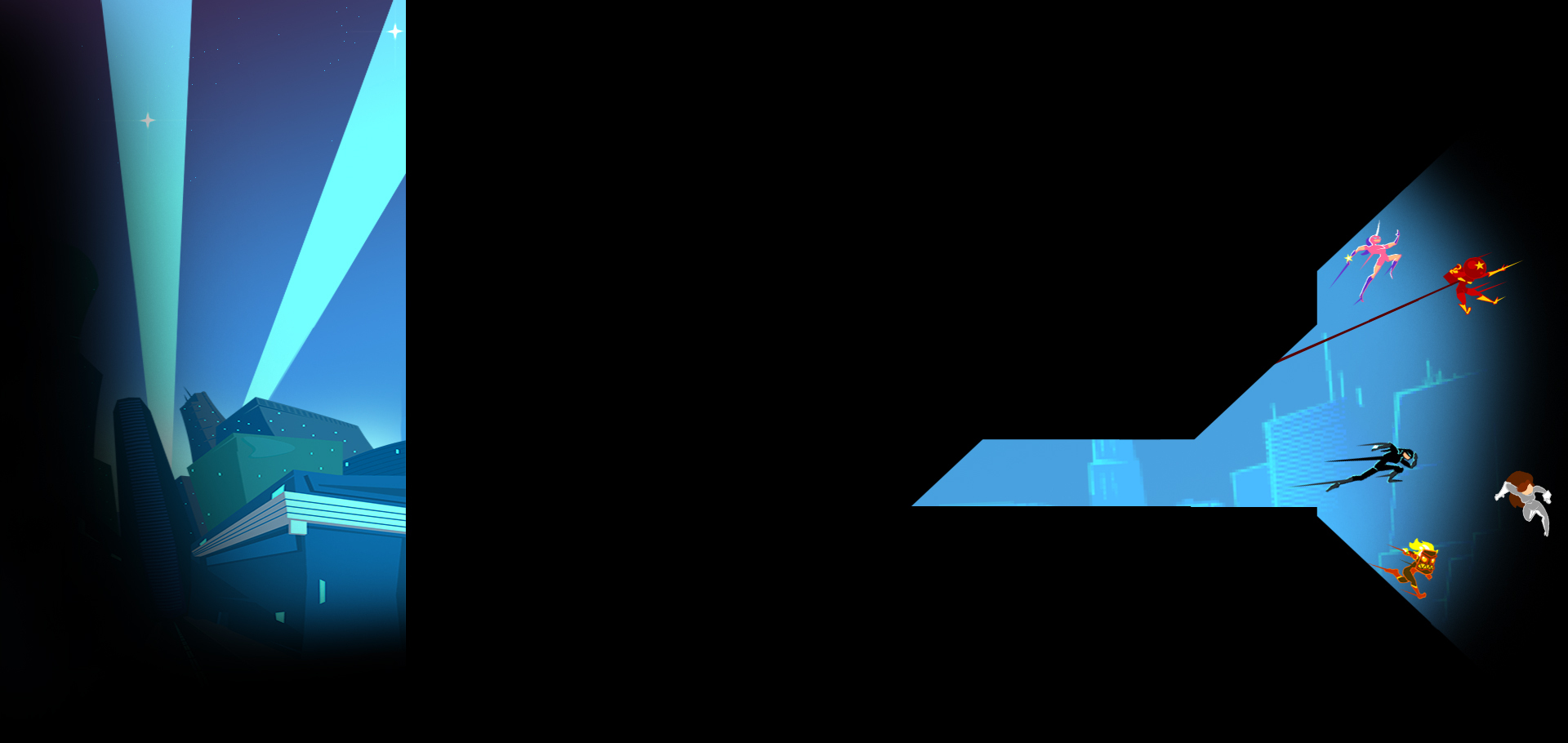 In a city filled with superheroes, getting to crimes becomes a competition on its own. Fortunately there are enough rockets, bombs, grappling hooks, spikes, and other goodies lying around -- to make the competition fun and fast. Welcome to SpeedRunners.