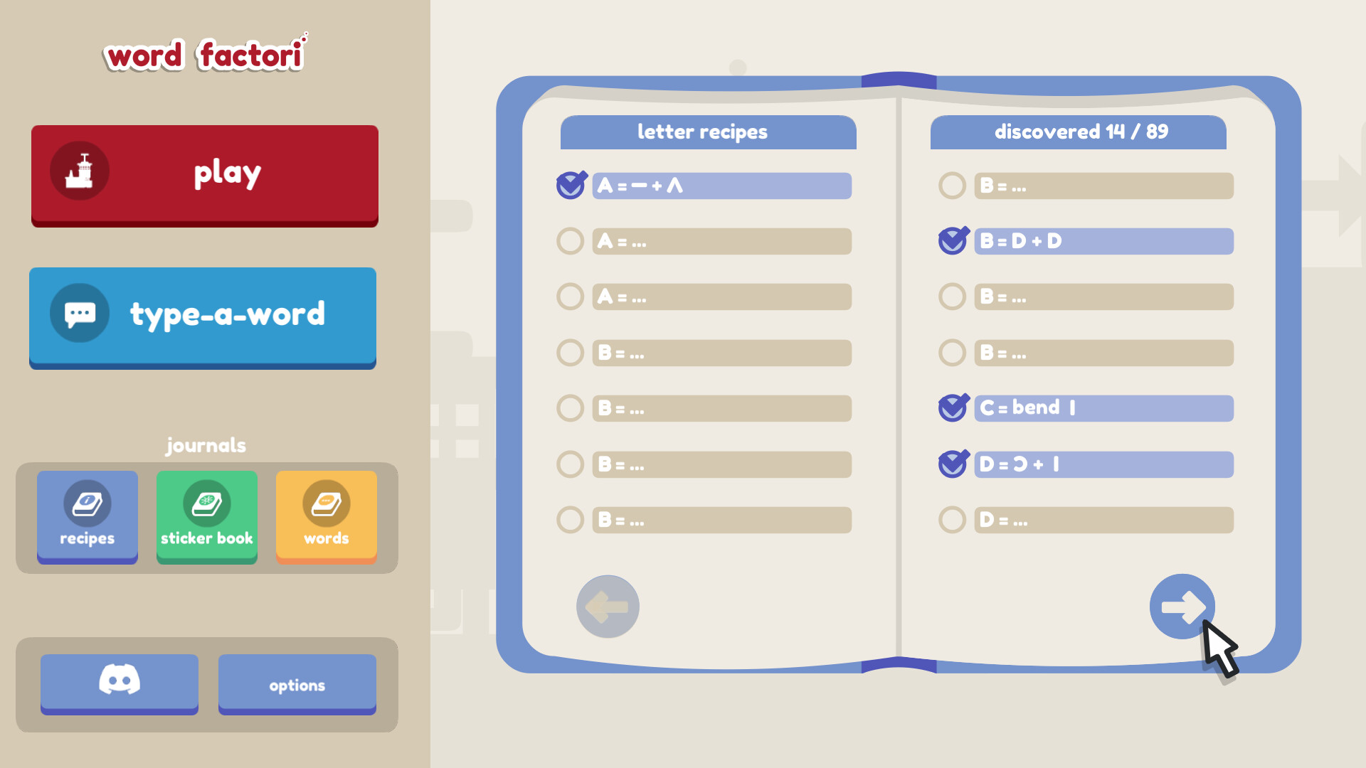 Word Factori is a word-building game where your only resource is the letter "i". Build a chain of factories to bend, rotate, reflect, and merge "i" into more complex letters. Discover secret letter recipes, unlock hidden word art, and optimize your factory chains for high scores.