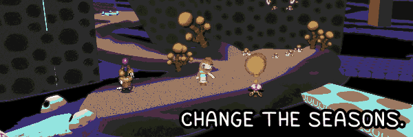• At Harvest Season's peak, you'll find a variety of bouncy mushrooms, fruiting plants, and your Boss, wondering why you haven't reported for your Harvest Season work shift.