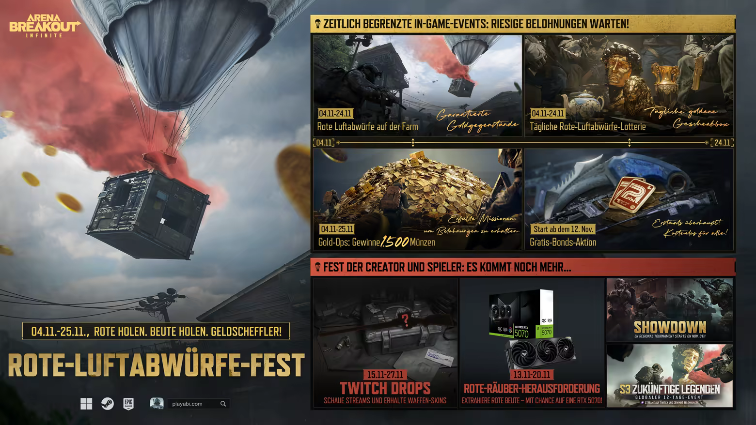 Die Schlachtfelder von Kamona werden schon bald in Neonfarben getaucht – denn die düstere Hightech-Welt von Cyberpunk 2077 prallt erneut auf Arena Breakout: Infinite. Diese Kollaboration ist nicht nur ein Crossover; es ist ein vollständiges Eintauchen in die Cyber-Dystopie von Night City, die mit präziser Genauigkeit nachgebildet wurde, um eingefleischte Fans und Neulinge gleichermaßen zu begeistern. Kollaborationsaufgaben und ein exklusiver Kampfpass sind mit passenden Cyberpunk-Themen verfügbar. Erarbeitet euch exklusive Beute, mit der ihr den Geist von Night City in jeden Raid tragen könnt.