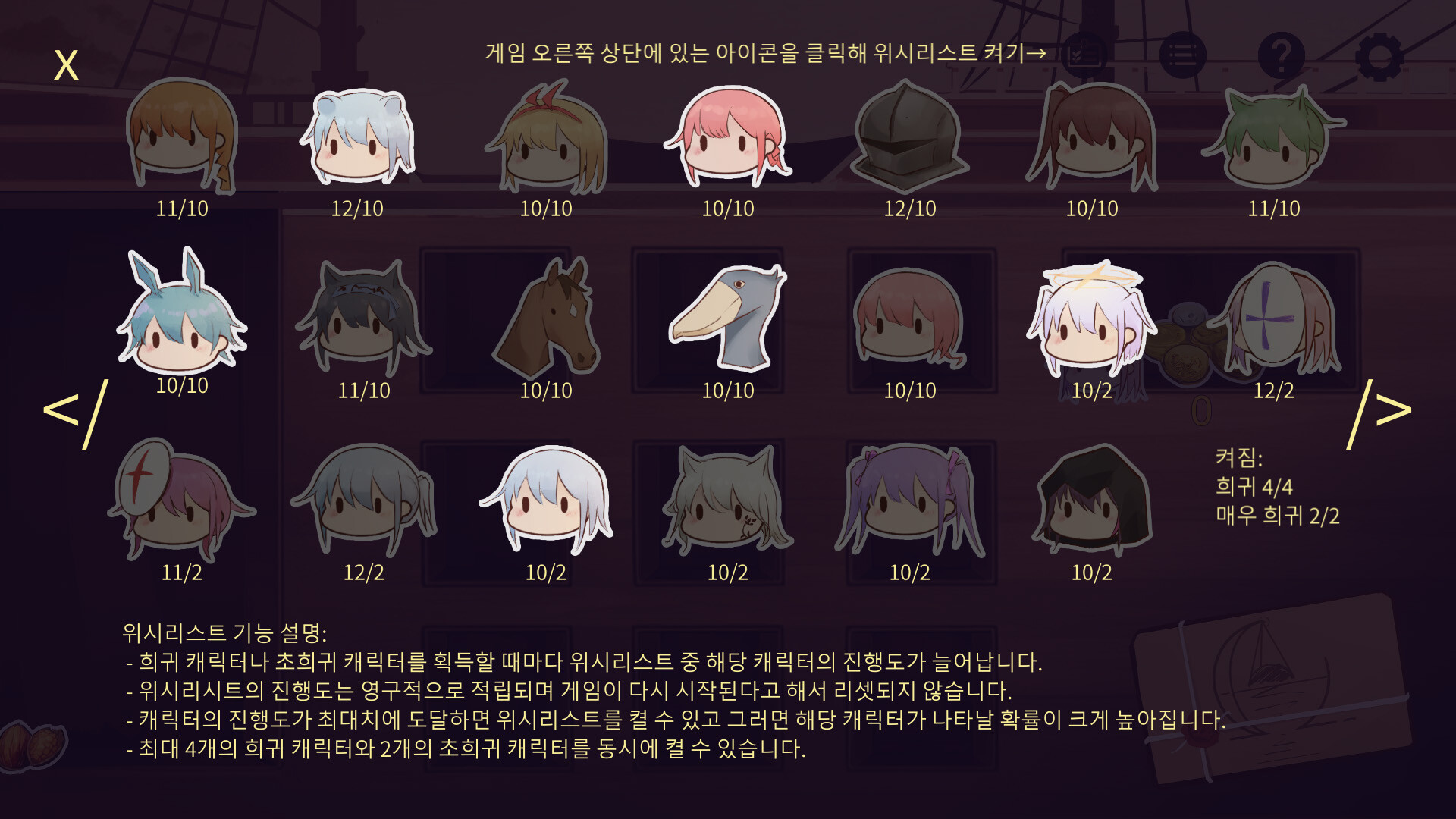 그 다음 캐릭터를 선택해야 합니다. 캐릭터들은 목표 지점 자체와 희귀 캐릭터를 획득하는 데 도움이 되는 캐릭터 등 다양한 요인에 의해 랜덤으로 나타나며 또 배가 얼마나 많은 화물을 운송할 수 있는지도 결정합니다.