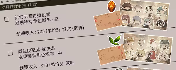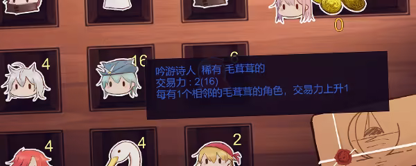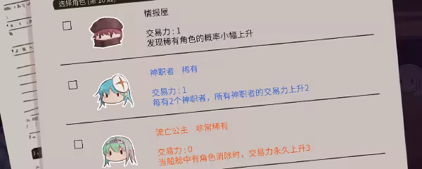 然后你需要选择角色,角色受各种因素影响随机出现,包括目标地点本身,和帮助你获得稀有角色的角色等等,角色决定了船能运送多少货物。