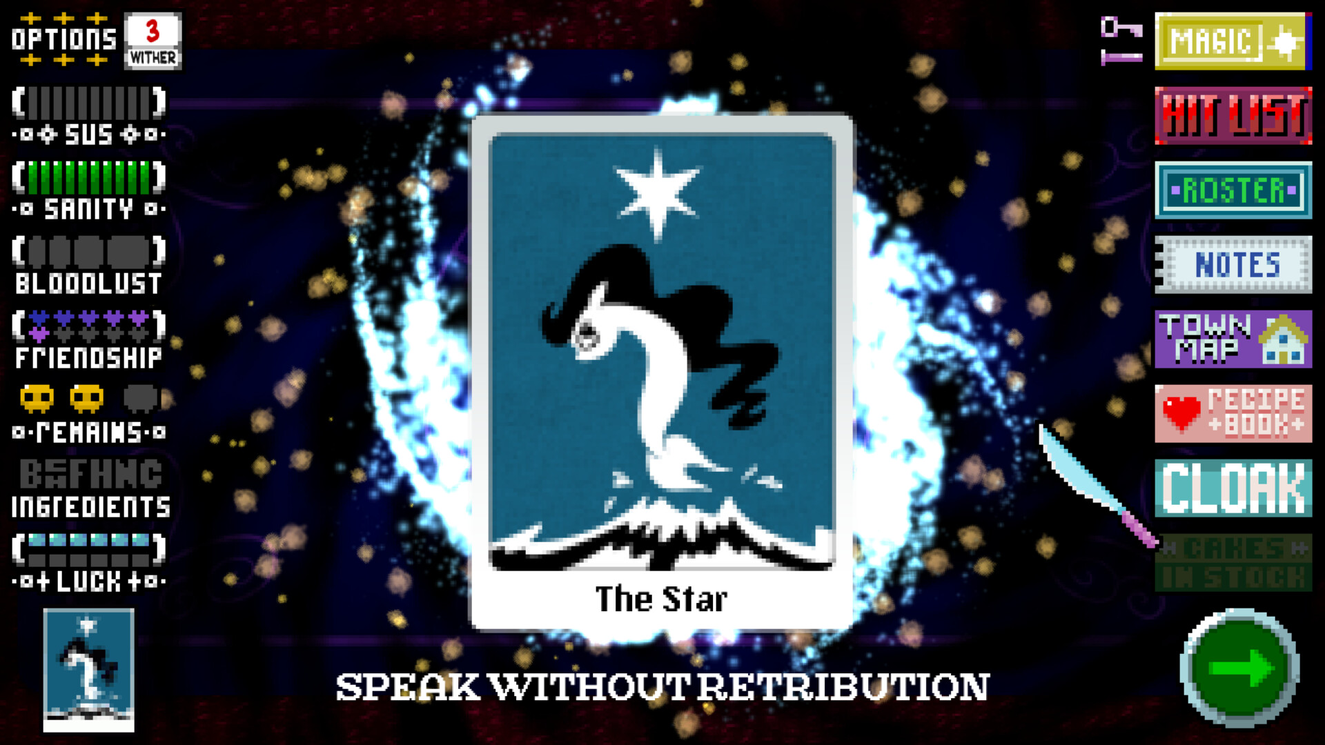 You are not alone - you have your faithful pet who can be sent out to perform tasks during the day while you work your trade as a confectioner. There is also a mystery pony in the town who is aware of what you are and has become a twisted fanatic. Your pet and this dark Disciple will help you learn the roles of the Town Council and where they live. Armed with this information you can decide who presents the greatest threat - if the town uncovers your identity, they will surely avenge themselves by lynching you!