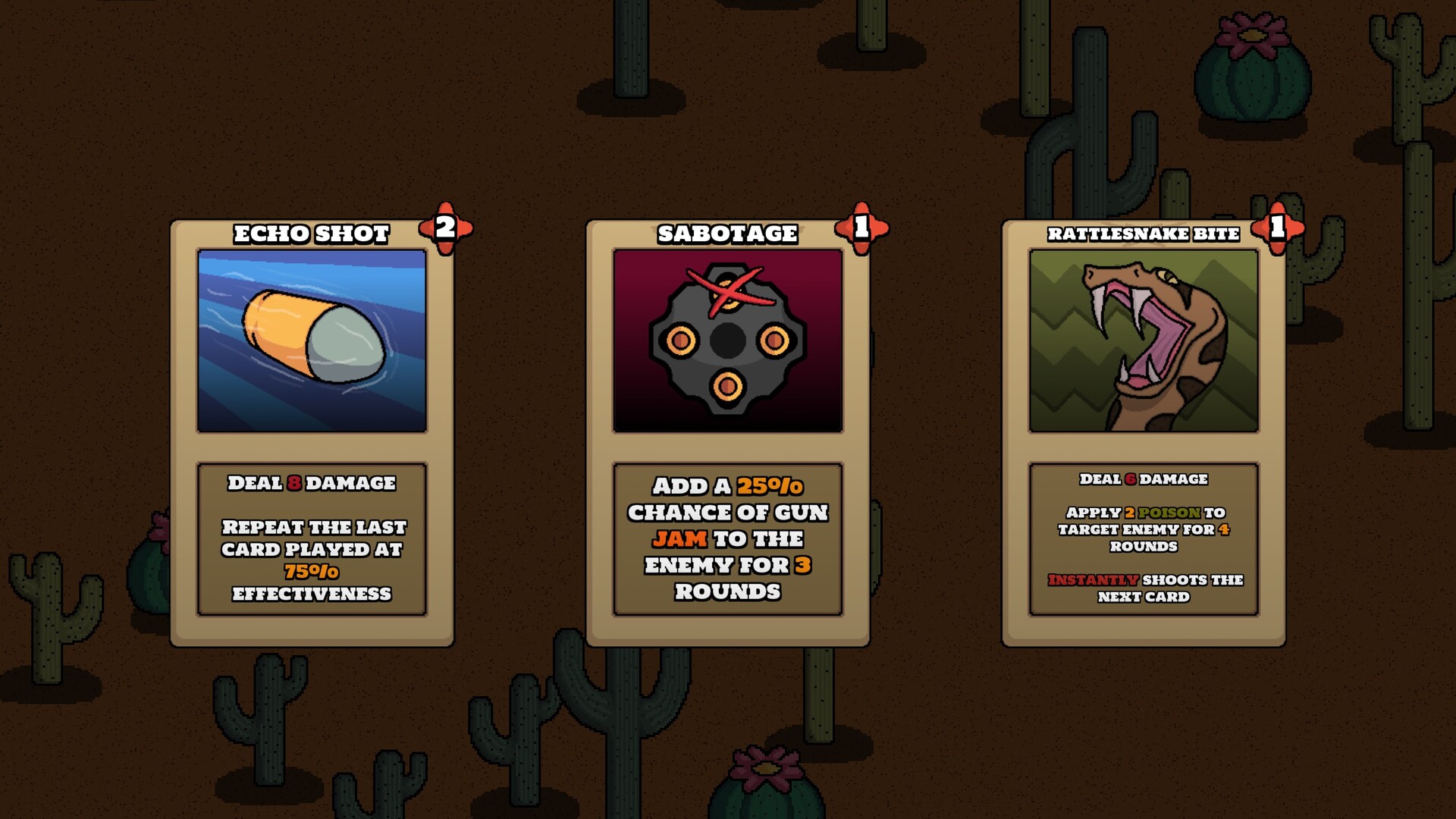 Saloons, in denen du gute Angebote für Karten findest, die du deinem Deck hinzufügen kannst, und in denen du etwas trinken kannst, um deine Gesundheit wiederherzustellen (trink nicht zu viel, sonst wird dir schwindelig).