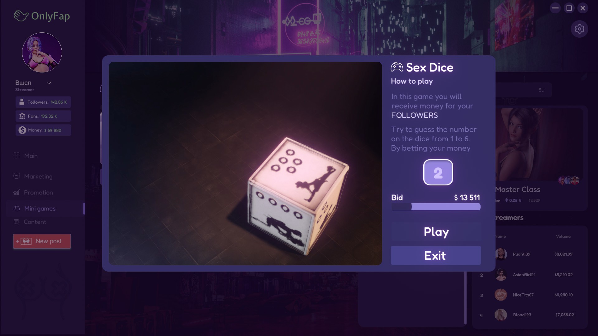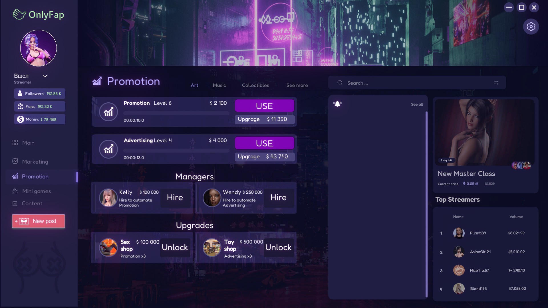 OnlyFap Simulator 2 is a casual clicker adult game that looks like a popular social media.You should help main character to earn enough money to start making streams. After every reached goal you gonna be surprised with amazing video with female protagonist.