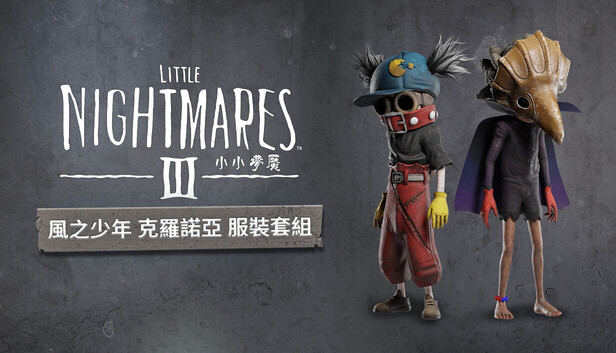 「風之少年克羅諾亞服裝套組」將《風之少年克羅諾亞》系列中的兩名經典人物帶入《小小夢魘3》的詭譎世界。「克羅諾亞」(Klonoa)的冒險精神與「加帝烏斯」(Ghadius)的危險氣息,在同時體現了魅力與詭譎元素的獨特服裝上碰撞出奇特火花。