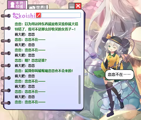 Komeiji Koishi, the popular character of Touhou Project, has come to your desktop! This is a cute desktop pet - Desktop Youkai. You can touch her, feed her, chat with her, and set up your own unique interactive response. How will the monster girl from the ground respond to your greetings?