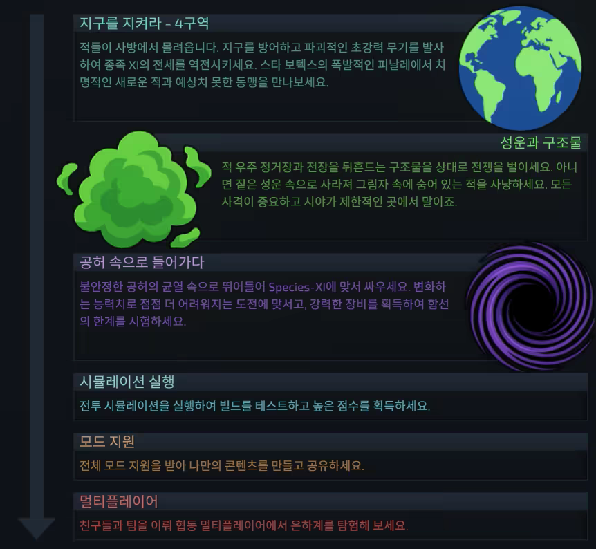 “멋진 아트 스타일에 탄탄한 조작감. 전투도 훌륭하고 콘텐츠도 풍부합니다. 멋진 우주선 제작, 탐험할 수많은 섹터, 스킬과 업그레이드까지! 이 게임이 이렇게 재미있을 줄은 정말 몰랐어요.”