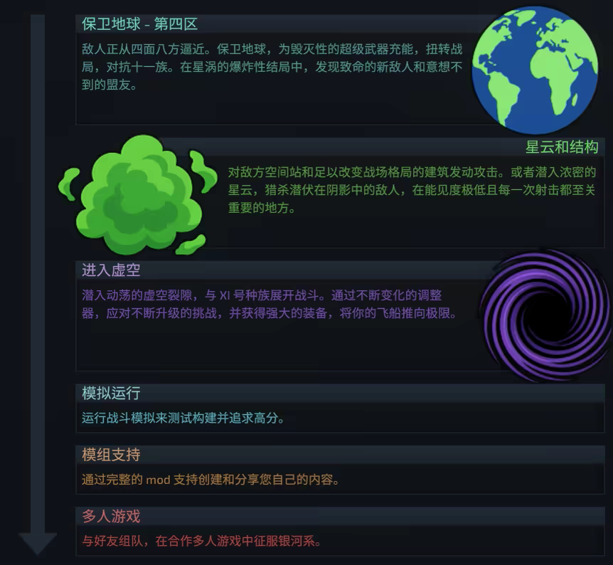 《深空涡旋》作为俯视角动作角色扮演太空射击游戏,借鉴了《暗黑破坏神2》等经典作品的设计思路。人类世界四面楚歌,新的威胁又凭空出现,开始攻击人类军队。必须向地球发出预警,以便人类防备新的敌人,你将负责护送母舰返回,传达这个坏消息。