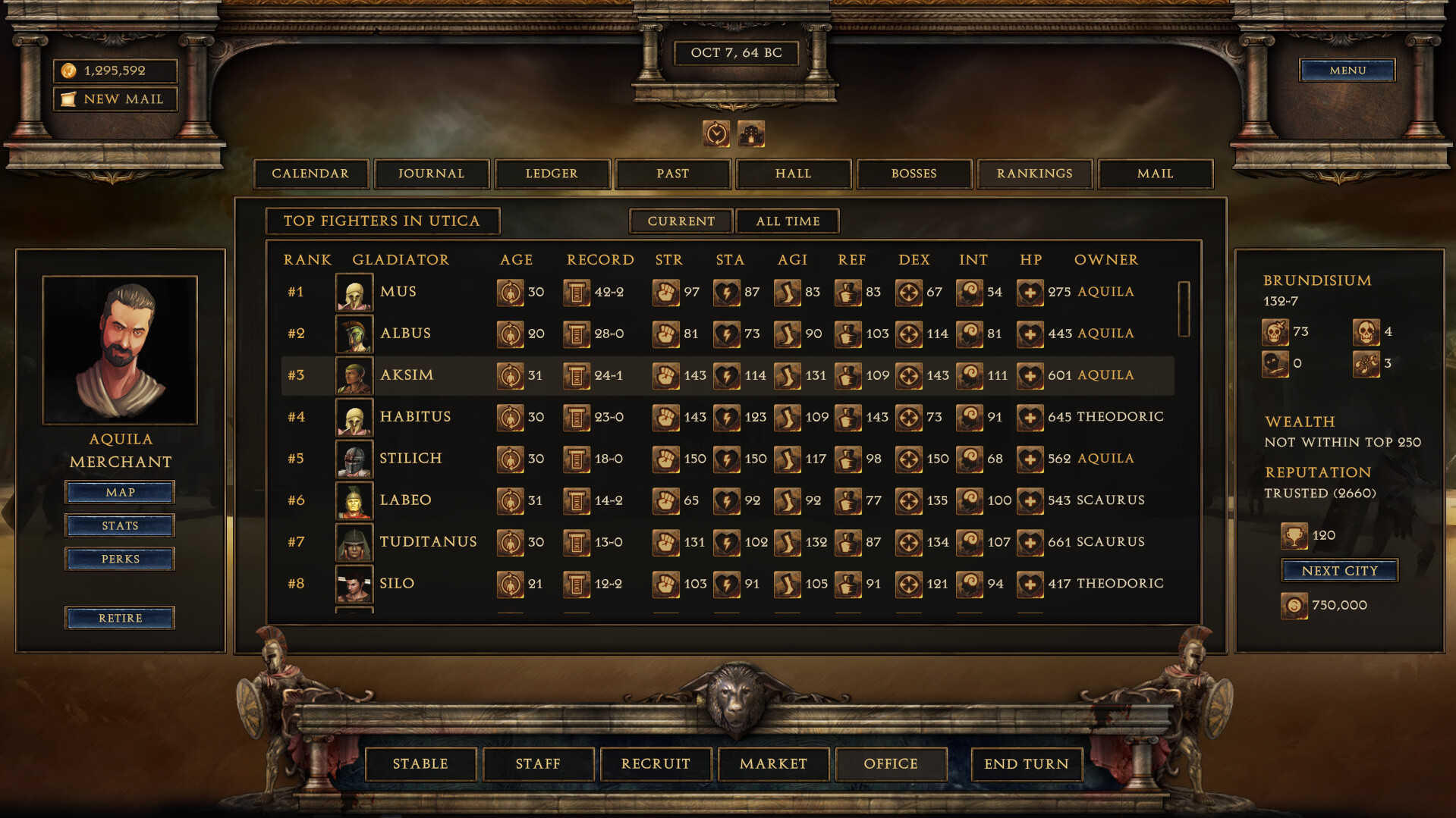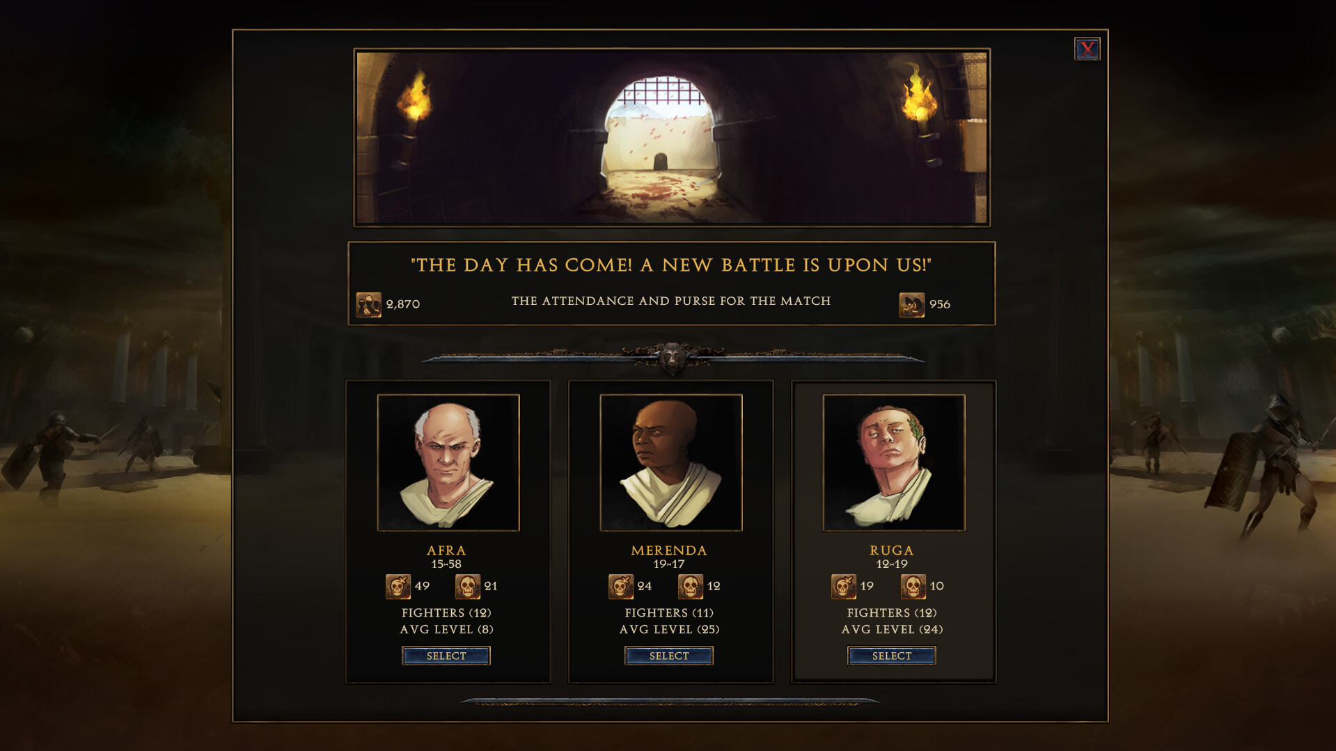 So maybe you should send your top fighter into the arena. He is bruised up and fatigued – but he also is ranked 3rd overall by the so-called experts and pundits of Leptis Magnus, the current city you reside in. You know he is one of the best and might still have a good chance at pulling out a win.