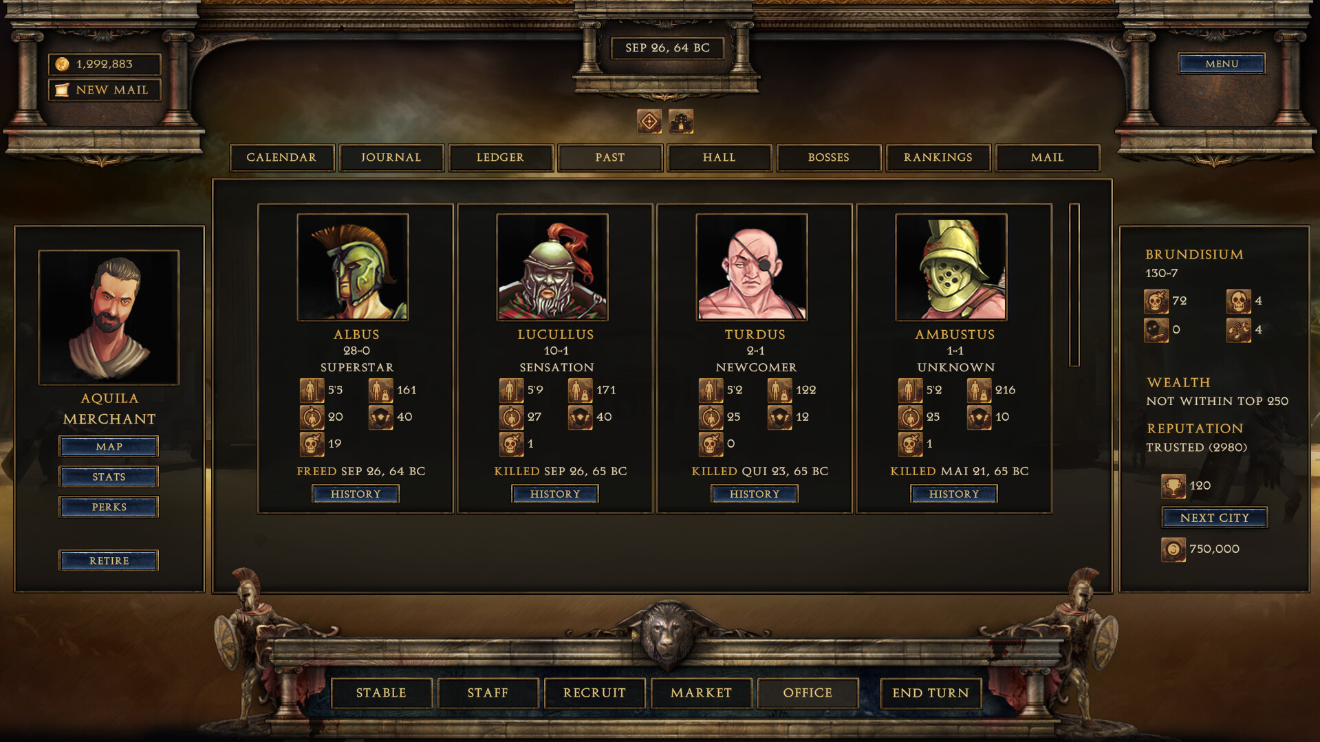 • Strive to become the wealthiest individual in the entire Roman republic. There are quick and underhanded ways to make money, but your reputation and fighter’s morale may suffer as a result.