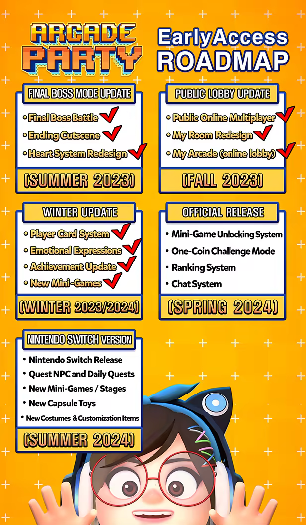 “The current version includes 20+ mini-games, 4 stage effects, and boss battles. Explore the world of arcade with your friends through online/local play using the 'My Arcade' public lobby system!”