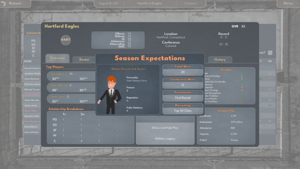 College Basketball Manager introduces an innovative recruiting system with thirteen key "pitches" that represent various aspects of your basketball program. These pitches, such as Feeling Wanted, Playing Time, and Proximity to Home, are graded on an A-F scale, providing an overview of your school's strengths and weaknesses. The recruit's perception of each pitch is pivotal, and their knowledge about your program can be influenced through strategic actions like calls and campus visits. What sets this system apart is your ability to sway recruits on the importance of each pitch, allowing you to strategically shape their preferences and secure their commitment to your program