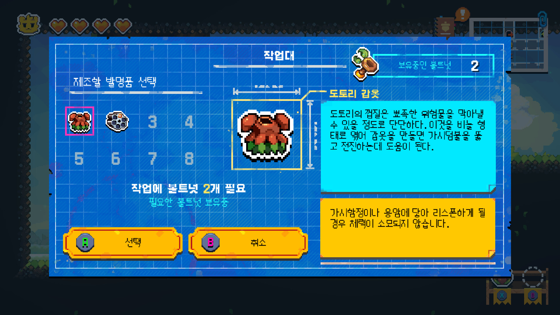 - 다양한 무기를 활용한 퍼즐을 풀어나가는 2D 탐험 플랫폼 게임.