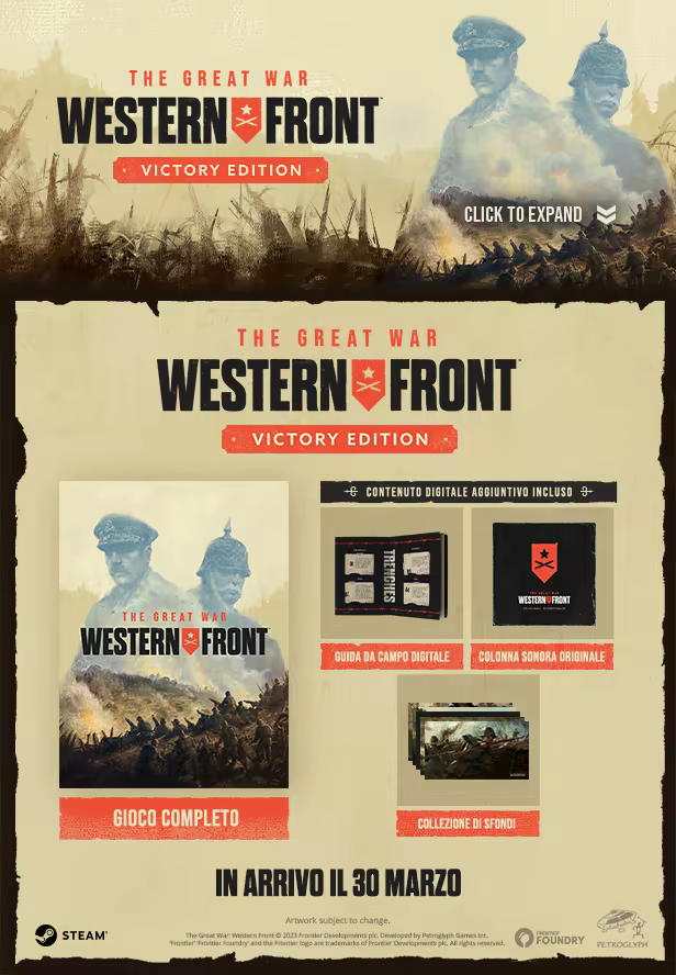Scegli una fazione e guidala alla vittoria impegnando i tuoi eserciti in cruente battaglie in tempo reale e prendendo decisioni importanti nella componente strategica a turni del gioco. Scava trincee dettagliate, ricerca nuove tecnologie come gas velenosi e carri armati, e prendi decisioni che avranno un impatto profondo e duraturo sul tuo successo. Pensa come un comandante per rivivere la storia... o riscriverla.