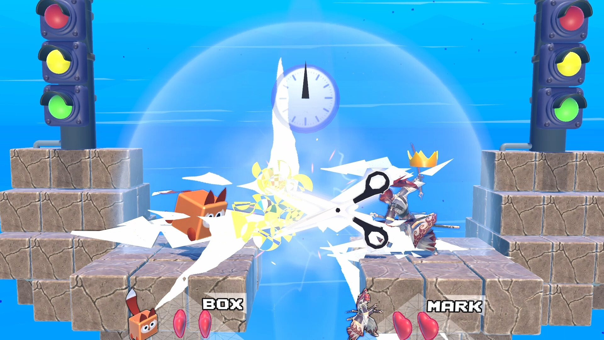 Mark boasts disjointed sword attacks and has unique movements when attacking; Scissors performs a forward dash, Paper is akin to an extra jump with an uppercut motion, and Rock does a downward fast falling dive.